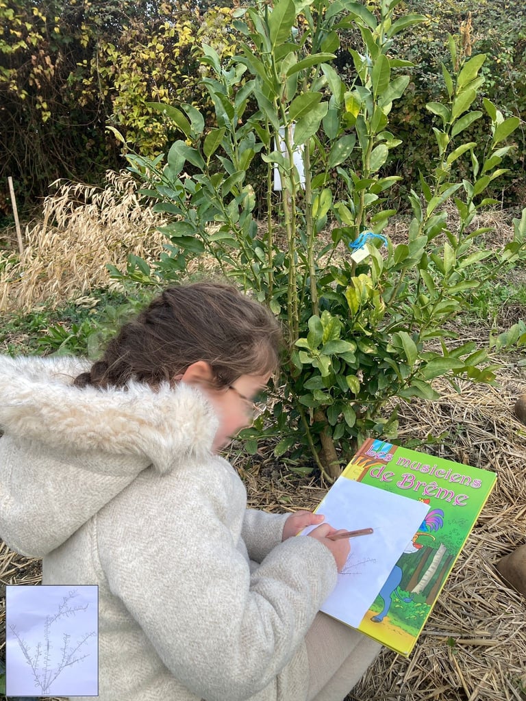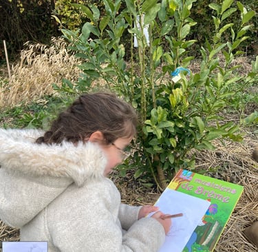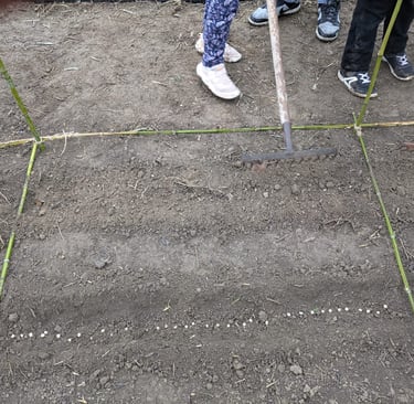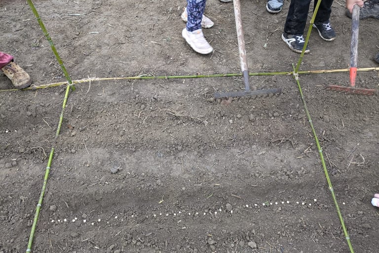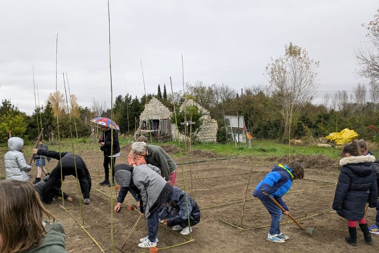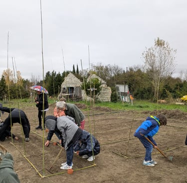 Aujourd'hui nous avons semé du blé ancien Pétaniel et des petits pois à rames avec 25 enfants de l'école Montolivet. Quelques gouttes sont tombées qui n'ont pas du tout dérangées les enfants très concentrés.